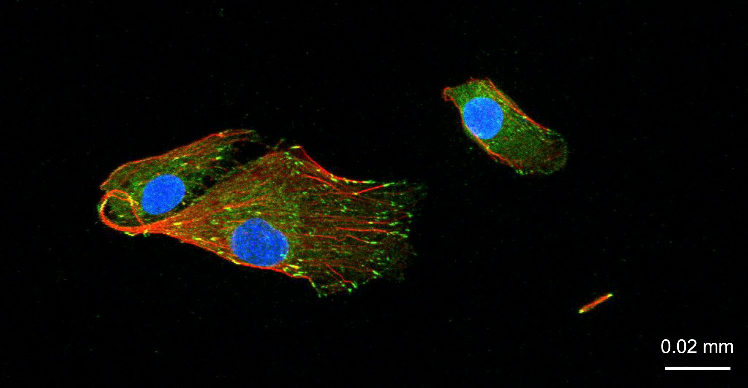 私たちの研究室では、 細胞が持つ触覚の中でも、 半径数百µm~数mm程度のゆるやかな曲面を認識する仕組みを研究しています。 このように、 細胞よりも数十~数百倍大きく緩やかな曲面は、 長い間、 細胞にとっては単なる平面であると考えられてきました。 ところが、 いざそのような曲面を加工して細胞を培養してみると、 細胞はその上をダイナミックに動き回り、 産生するタンパク質の量を変えるなど、 平面上とは振る舞いをガラリと変えることが明らかになってきました。分子・細胞よりもはるかに大きな物体の形状は、 どのような仕組みで細胞に認識されているのか?その仕組みが明らかになると、 例えばステントのような体内へ移植する道具に様々な加工を施し、 細胞の病変を防ぐような、 画期的な医療素材の設計ができるようになるかもしれません。 細胞の「触覚」の仕組みを理解し、 「力学」を介して細胞の行動を制御する新しい技術の創成を目指し、 私たちは研究を進めています。