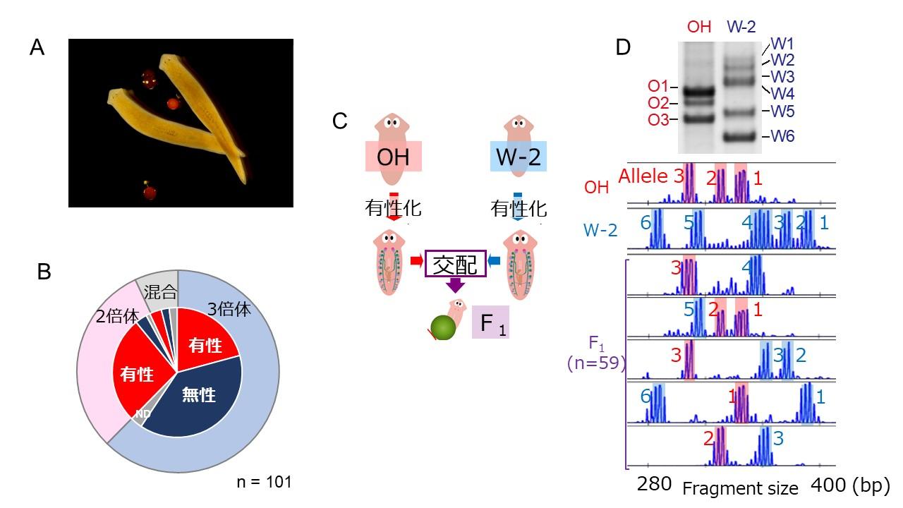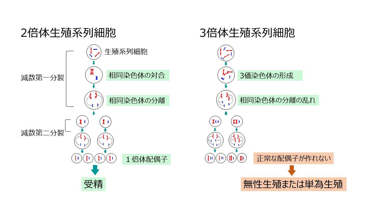 この有性生殖をおこなっている私たちは父親からのゲノムセットと母親からのゲノムセットを合わせて2セット持っている2倍体です。減数分裂では父母由来の染色体が並び結合する対合が起こり、父母由来の染色体が交差してキメラ状になるために、偶数倍のセットを持っていることが必要です。そのため、3倍体の生物は対合がうまくいかず減数分裂ができないというのが定説です。その定説を覆したのが、プラナリアです。プラナリアの一種リュウキュウナミウズムシには2倍体の個体と3倍体の個体が共存しています。プラナリアは有性生殖する個体と無性生殖する個体が共存しているので、2倍体個体が有性生殖していて、3倍体の個体は無性生殖(単為生殖:卵だけが受精せずに発生する生殖方法)していると考えられていました。しかし、私のグループでは3倍体個体の親子鑑定を行ったところ、子供には両親の遺伝子がキメラ状に混じっていることがわかりました。これは3倍体の個体も有性生殖をできることを示しています。私たちはプラナリアが特殊な減数分裂をおこなっていることを発見しました。より多様性を増やし生き残るために、3倍体個体も特殊な減数分裂を獲得したのだと考えられます。みなさんは、このような研究を聞いて、どう思いますか?直接、人間には役には立たたないかもしれないけれど、生命が織りなす現象は不思議の塊ですよね。