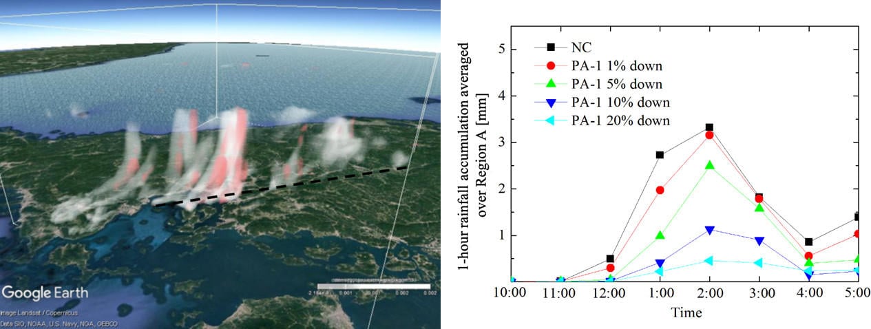 21世紀の流体力学では、自然現象の予測や産業機器の設計における流体シミュレーションの信頼性を増していくとともに、流れを自在に制御することによって、社会に貢献していけると良いなと考えています。図1は海洋研究開発機構(JAMSTEC)との共同研究で行った数値シミュレーションの一例ですが、この研究からは、この地域にある家庭用エアコンのフル稼働に相当する量の除湿によって、線状降水帯による豪雨を抑制できる可能性が示されています。大学の研究室の予算規模やタイムスケールではいきなり大きなことはできませんが、このような革新的な流れ制御のアイデアを、数値シミュレーション結果を用いて提示していくことが、社会を動かしていくための種として重要だと考えています。また、近年の第3次人工知能ブームの影響で流体力学への機械学習技術の応用が世界的に盛んになっており、我々のグループでも2018年度から科研費の補助のもと、このテーマに積極的に取り組んでいます。他にも、量子コンピューティングの活用など、21世紀の流体力学には大きな可能性が秘められています。古くて新しい学問、「流体力学」の今後の進展にご期待下さい。