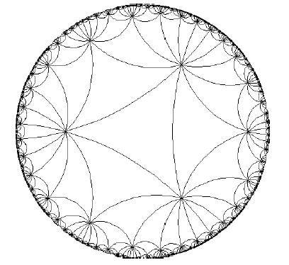 という距離d(・,・)を与えた距離空間です。|wn|→1となるような双曲平面の点列{wn}は、任意にとった双曲平面の点zに対し、d(z,wn)→ ∞を満たします。つまり、双曲平面の縁にあたる単位円周は、双曲平面の住人にとっては、無限に遠いところにある「理想境界」なのです。双曲平面における直線は、その理想境界である単位円と直交する円弧になります。下の図は一つの角がπ/6の双曲正三角形によるタイリングです。(この図からも双曲平面では平行線の公準が満たされていないことがわかります。)