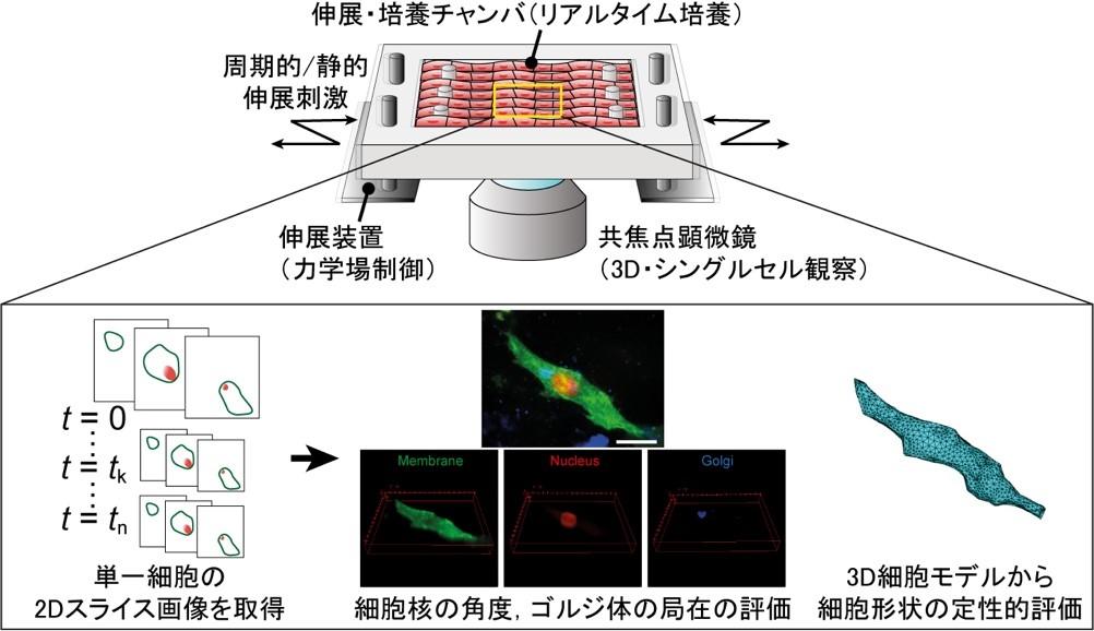 そこで私たちのグループでは、光学ライブイメージングシステムと機械的伸展装置を組み合わせることにより、力学刺激条件下にある三次元組織内の単一細胞のトラッキング解析を可能とするシステムを開発しました [1](図)。システムは、ポリジメチルシロキサン(PDMS)伸展培養チャンバと三次元骨格筋C2C12組織、力学進展刺激を印加する高精細ステージとその制御部、およびレーザ共焦点顕微鏡で構成されます。C2C12細胞は遺伝子導入により細胞核、細胞膜、ゴルジ体が3重蛍光染色されていて、三次元組織内での細胞の位置(細胞核)、細胞の形状(細胞膜)、細胞の移動方向(ゴルジ体)がライブイメージングにより取得できます。私達はこのシステムにより、単一のC2C12細胞が力学刺激によってどのような振る舞いをするのかの観測に成功しました。また、力学刺激印加の条件下において、個々の細胞によって異なる挙動(細胞の個性)を示すことを見出しました。このシステムを発展させることにより、私たちの身体の中で日々起きている単一細胞と組織との間での階層化された力学応答のメカニズムの理解につなげていきたいと考えています。
