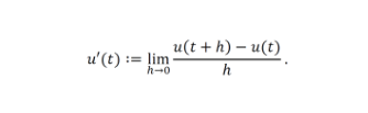 これが「微分」と呼ばれる概念です。𝓊'(𝓉) が存在するかどうかは非自明であり、「限りなく近づく(極限)」の厳密な定義とともに関数の微分に関する様々な事柄が整理されています。また解析学では、運動の法則から帰結されるものを含む一般の常微分方程式を解くための理論も整備されています。すなわち、常微分方程式の初期値問題の一般形(高階の常微分方程式もこの形に変形される)