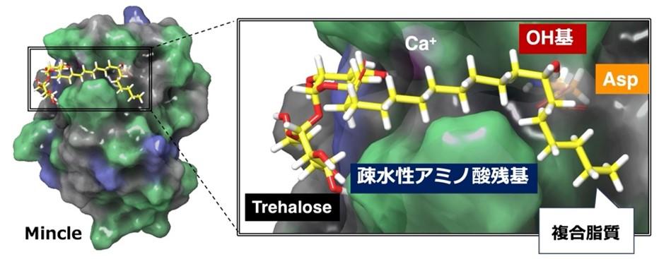 一例として、CLRの一種であるMincleに関連した研究を紹介します。Mincleは結核菌由来のトレハロースジミコール酸(TDM)をはじめとする天然由来複合脂質や自己糖脂質を認識し、自然免疫を活性化することが報告されています。しかし、リガンドの脂肪酸部位とMincleの相互作用の詳細は明らかになっていませんでした。