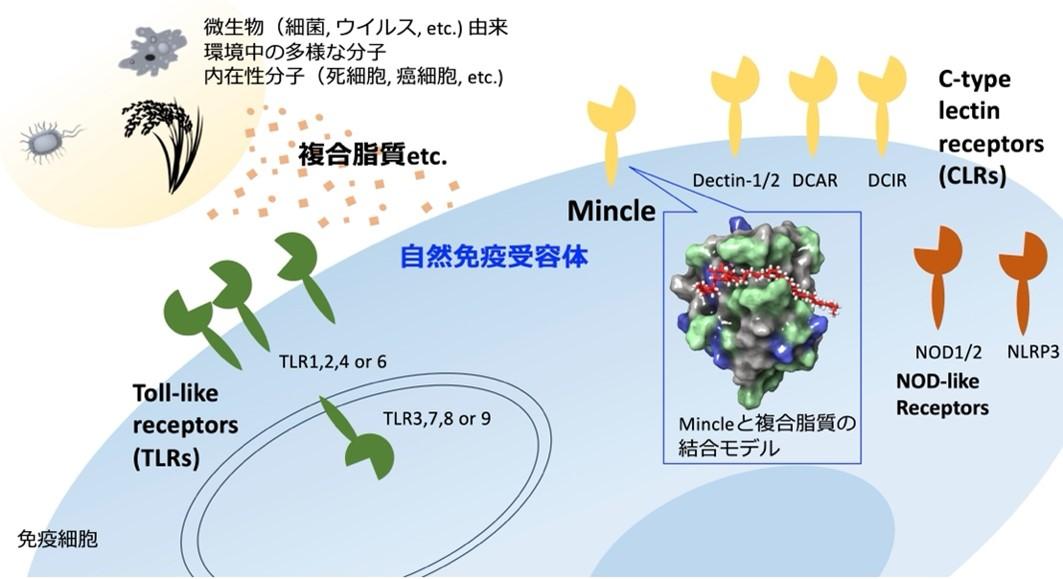 一方、自然免疫は、免疫細胞に存在する“受容体”タンパク質が特定の分子を検出するセンサーとして機能することで駆動します。さらに自然免疫は、複数の受容体が協働的かつ複雑に作用することで、免疫応答を精密に制御していると考えられています。その中でも、複合脂質を認識し、自然免疫応答を調節する受容体として、Toll-like receptors(TLRs)やC-type lectin receptors(CLRs)等が知られていますが、これらの自然免疫受容体に対して複合脂質が関与する制御メカニズムには、まだ解明されていない点が多く残っています。